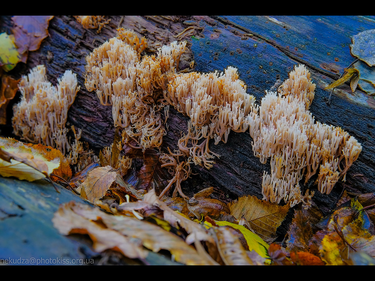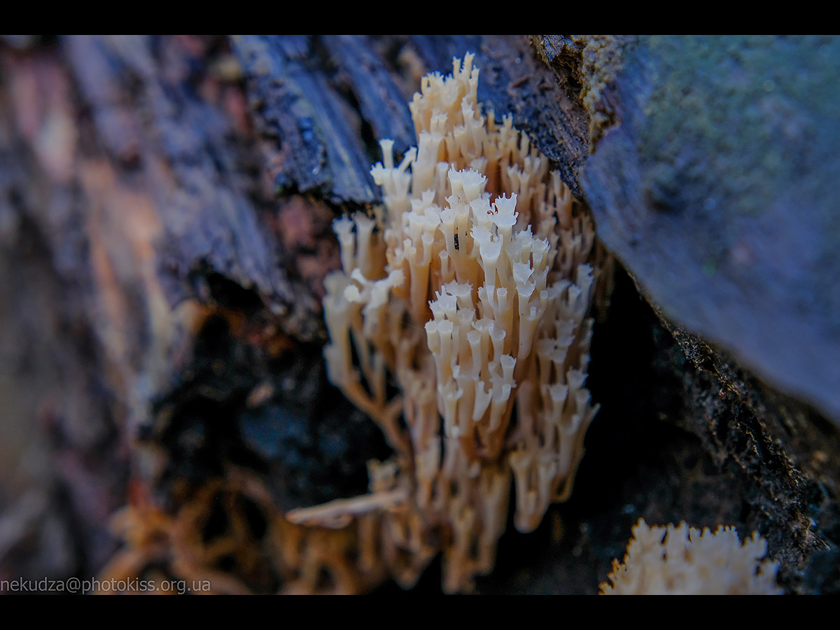 5. Гриб клавікорона криночковидна (він же рамарія гроновидна). Має характерну коралоподібну форму із численними розгалуженнями гілочок, за що отримав народну назву “оленячі ріжки”. Росте на мертвій деревині, нею ж і живиться.