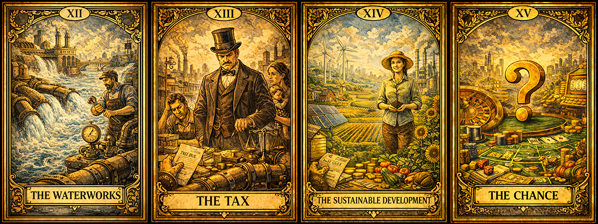 Електроенергетика (клітинка “Electric Company”) і вода (клітинка “Water Works”) символізують стихії, базові сили світу. Той, хто контролює стихії, контролює фундамент життя. Їм відповідають карти “Сонце” і “Місяць“.