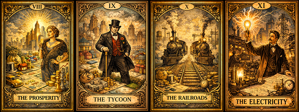 В грі є одразу чотири клітинки для залізниць, але всі вони, хоч і мають різні назви, нічим не відрізняються одна від одної символічно, тому для них один аркан — “Залізниця”, що, вельми очевидно, уособлює прогрес, рух уперед, перемогу, контроль над потоками інформації, ресурсів і людей. Очевидна відповідність — карта “Колісниця“.